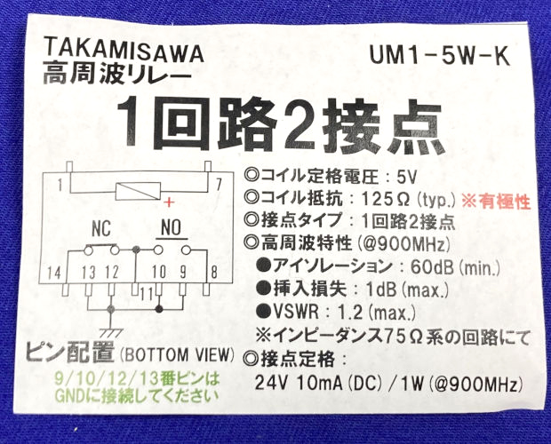 高見澤電機製作所の高周波リレーです。コイル定格DC5V。1回路2接点。