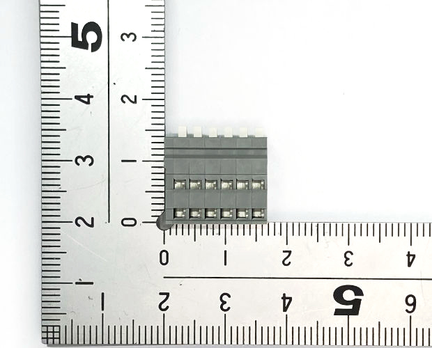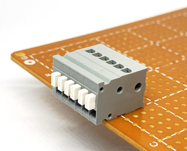 基板用、端子間ピッチ2.54mmの高密度スクリューレス端子台。ユニバーサル基板にも取り付け可能。側面配線に適するライトアングル(L型)タイプ。