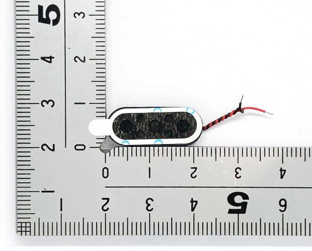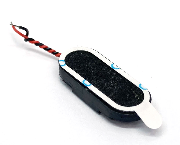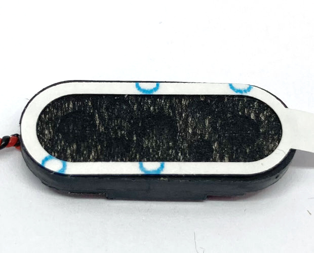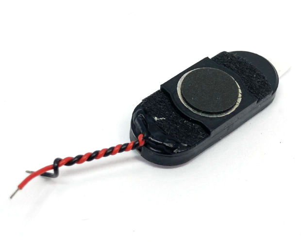 貼付け用の両面テープがついた楕円形の小型スピーカーです。リード線付。詳細不明。