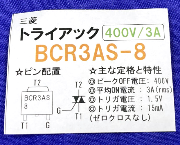 | 品名/型番 : | トライアック 400V 3A ゼロクロスなし (20個入) ■限定特価品■ / BCR3AS-8-20P |
