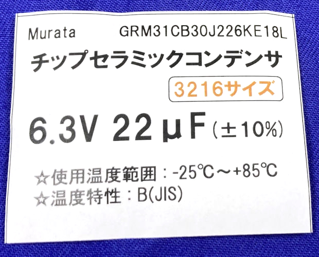 | 品名/型番 : | 3216サイズ チップ積層セラミックコンデンサ 6.3V 22μF±10% (50個入) ■限定特価品■ / GMR31CB30J226KE18L-50P |
