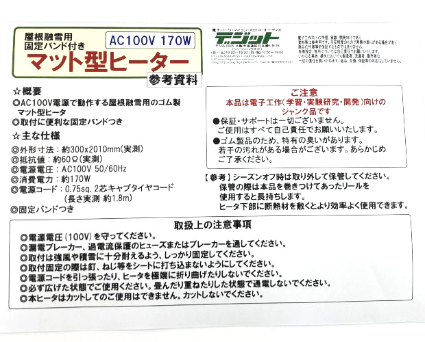 屋根融雪用マット型ヒーター AC100V 170W ■限定特価品■
