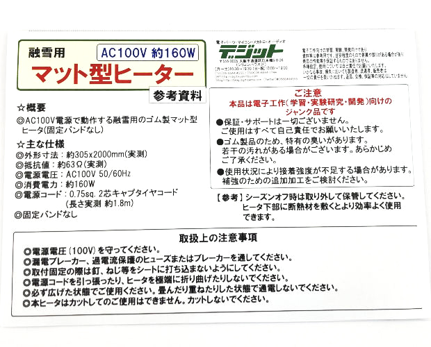 | 品名/型番 : | 融雪マット AC100V 160W(実測) ■限定特価品■ / HEARTMAT-160W-L2000-DJK |