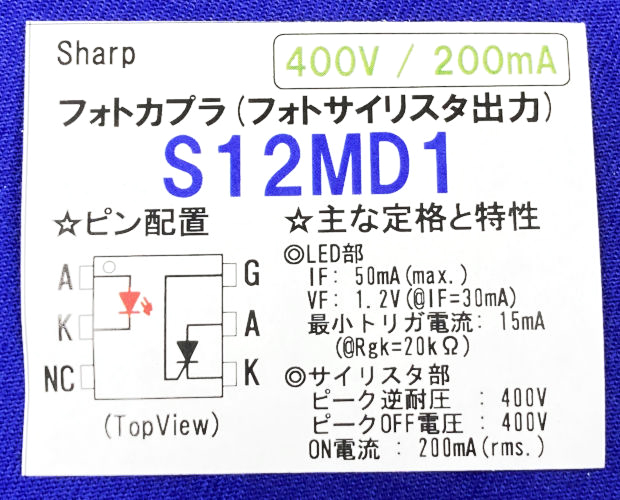 | 品名/型番 : | フォトサイリスタ 400V 200mA (50個入) ■限定特価品■ / S12MD1-50P |