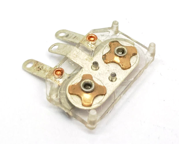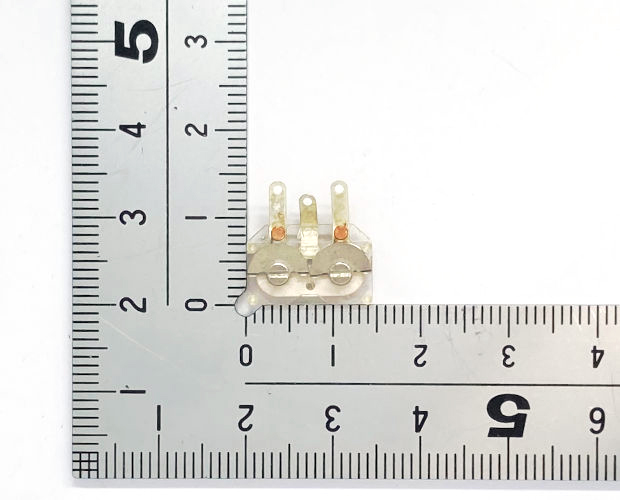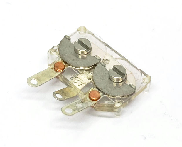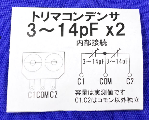 2回路入りのトリマコンデンサです。3〜14pF(実測値)×2個。真ん中の端子がコモンです。