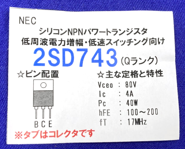 | 品名/型番 : | NEC 低周波電力増幅用NPNトランジスタ 80V 4A 40W (20個入) ■限定特価品■ / 2SD743-Q-20P |